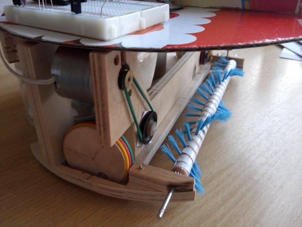 - Берем основание из фанеры, к нему крепим с помощью клея — двигатель, пылесборник, кулер, микросхема, аккумулятор, ИК лазеры передвижения. Стоит не забывать что у пылесборника должна быть трубка, позволяющая воздуху выйти наружу. Колеса решили взять уже готовые, то просто крепим к основанию.