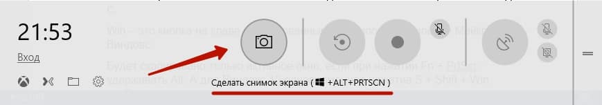 На Windows 10 и 8,1 разработчики придумали ряд особенностей для создания скриншотов. Например, в ОС Виндовс 10 одновременно зажатые кнопки на клаве Win + G открывают доступ к игровой панели. В ней располагается иконка фотоаппарата. Используя ее, владелец ноута может сделать скрин.