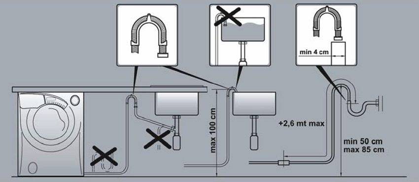 - Не наращивать сливной шланг длиннее, чем указано в инструкции для конкретной марки агрегата.