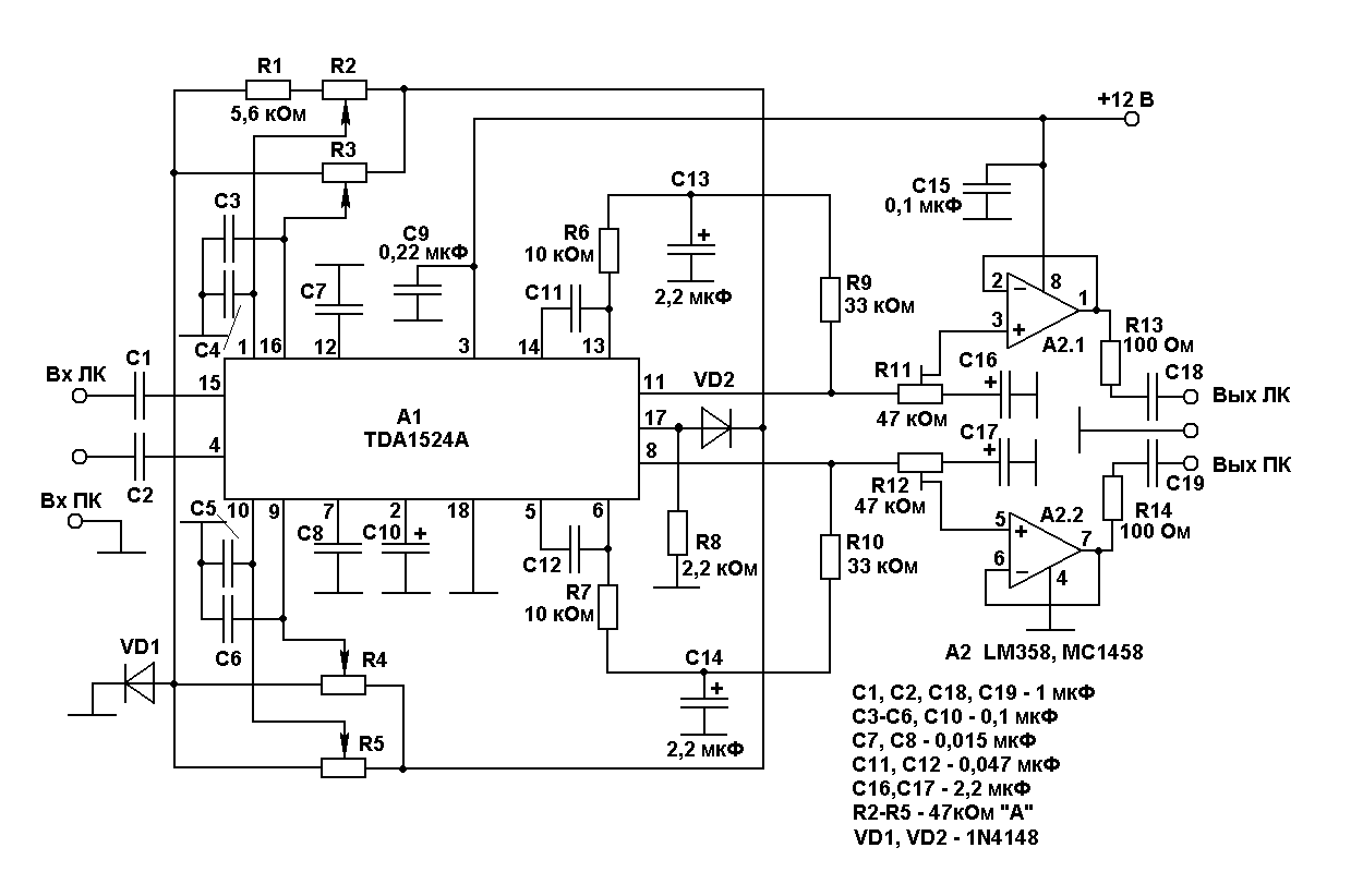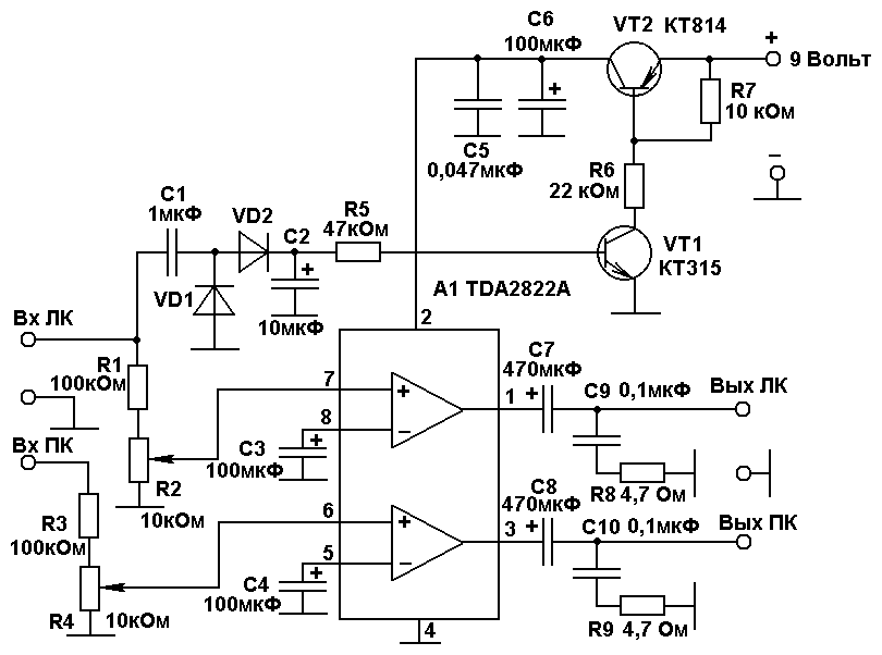 - Чтобы получить стерео систему, нужно создать две схемы, соответствующие правому и левому каналу.