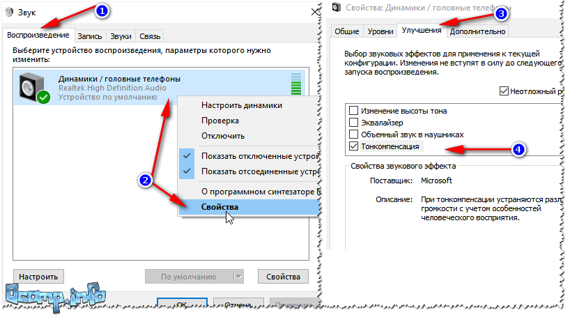 Есть в Windows еще одна опция, которая может существенно повлиять на громкость. Речь идет про тонкомпенсацию — спец. опция для устранения различия громкости с учетом особенности человеческого восприятия. При проблемах с тихим звуком — рекомендую эту опцию включить.