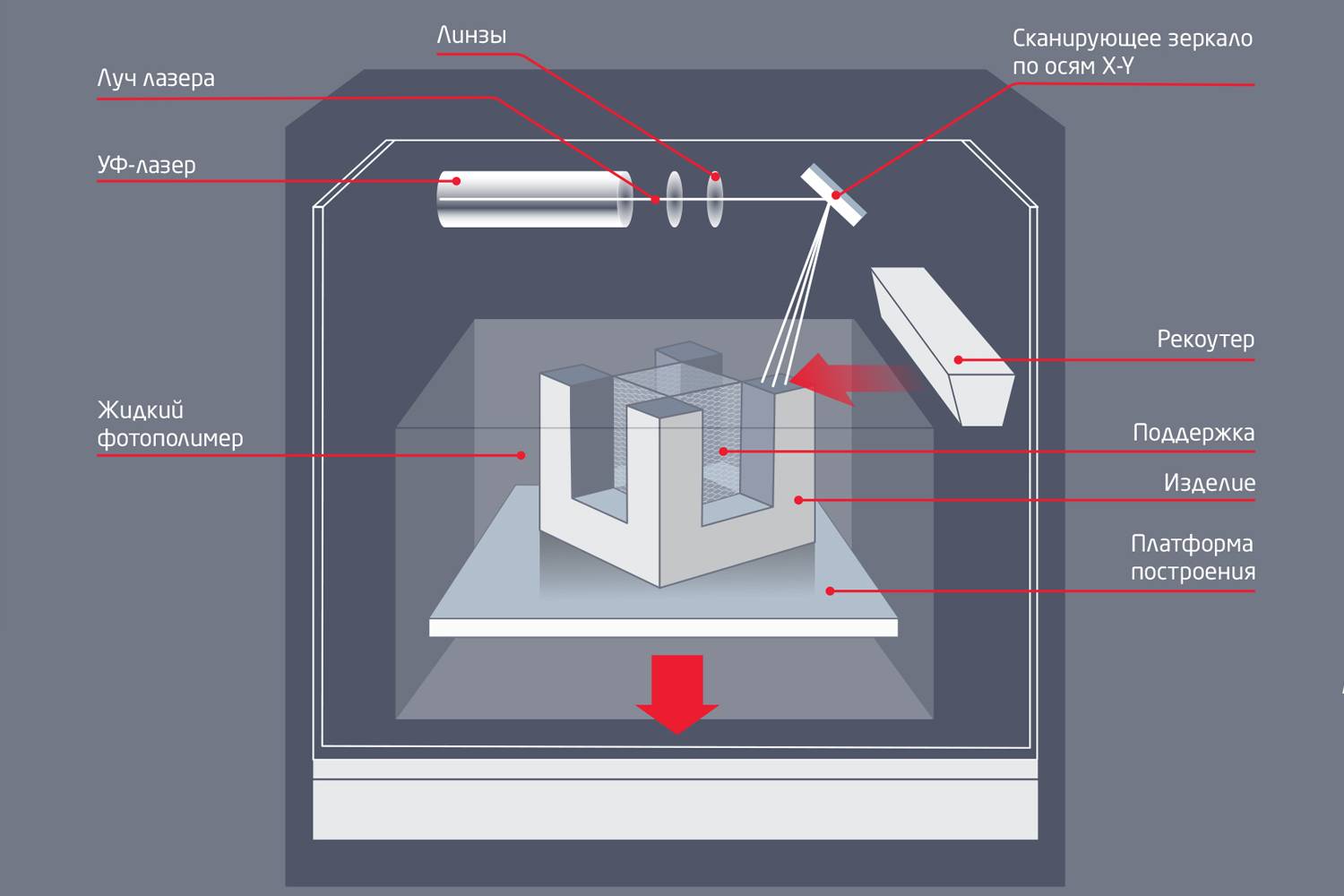 В SLA‑принтерах применяется лазер. Он выборочно засвечивает фотополимерную смолу, находящуюся в емкости принтера. Лазерный луч светит на дно резервуара и направляется зеркальными гальванометрами на точную область, подлежащую отверждению.