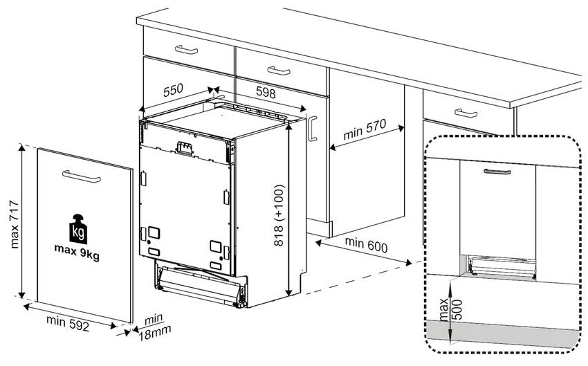 - Например, встраиваемая посудомоечная машина имеет размеры ШхВхГ 450х820х550 мм.