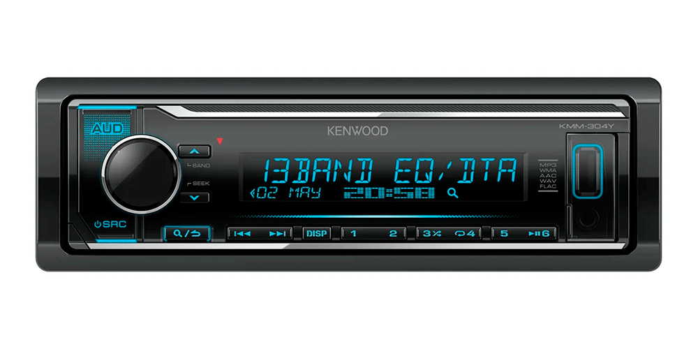 Пятое место занимает KENWOOD KMM-304Y. Продвинутое устройство с DSP-процессором и 24-битным ЦАПом на борту. 8 фиксированных пресетов и 13-полосный эквалайзер расширяют возможности регулировки звука, включая срез частот, канальную задержку и многое другое. Интересны и фирменные технологии улучшения звука: BassBoost, Sound Realizer, Stage EQ — коррекция высоких, низких частот и басов на разных уровнях громкости. По мнению многих экспертов автозвука, это действительно работает, что подтверждается и тестами, выполненными в профессиональных студиях звукозаписи.