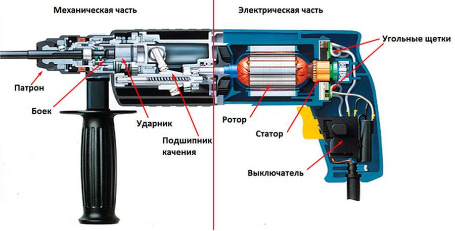 В бытовых дешевых перфораторах невысокой мощности двигатель устанавливают горизонтально. Данная конструкция позволяет хорошо справляться со сверлением и скалывание плитки