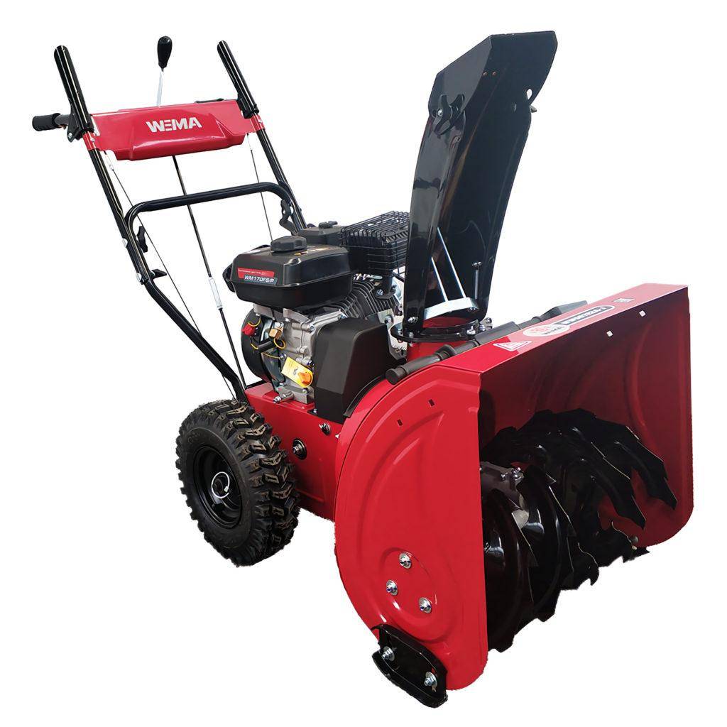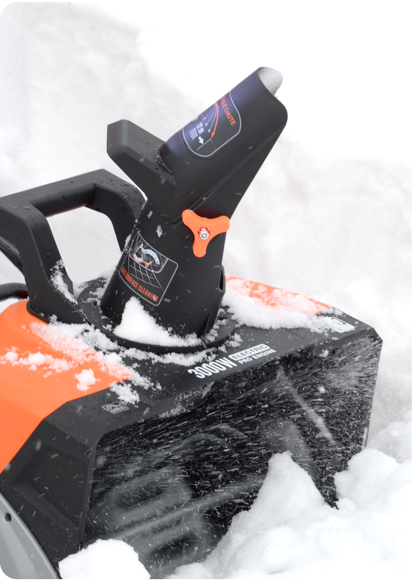 Выброс снега осуществляется через пластиковый желоб, положение которого можно изменить с помощью механической панели управления. Дальность выброса снега 9 метров. Мотор укомплектован электростартером, это упрощает запуск в ветреную и морозную погоду.