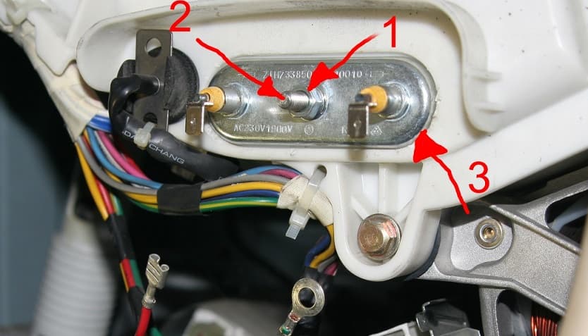 ТЭН определить достаточно просто по двум характерным разъемам, к которым подключаются провода. Впрочем, если под рукой есть омметр, перед тем, как снять, стоит проверить ТЭН – возможно, неисправность вызвана не его отказом. Сопротивление ТЭНа в рабочем состоянии не превышает 200 Ом, в противном случае он требует замены.