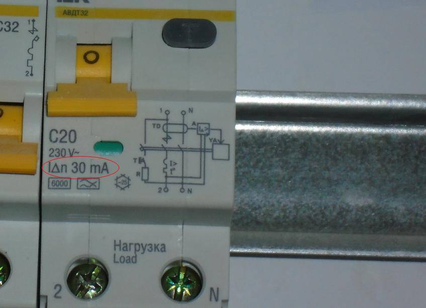 Номинал реагирования на утечку или дифференциальный ток (значение IΔn на корпусе) нужно выбирать 10 мА или 30 мА.