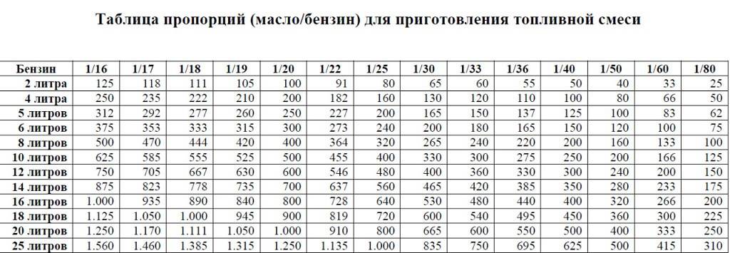 Рисунок 3 – Соотношения масла и бензина для топливной смеси