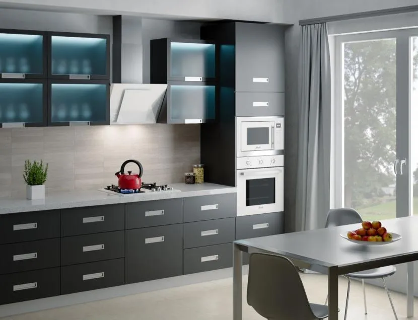 Ширина большинства моделей находится в диапазоне от 60 до 90 см, что позволяет монтировать их в кухне любого размера. Решившись на дизайн кухни с вытяжкой наклонного типа, кроме компактных размеров вы получаете следующие преимущества: