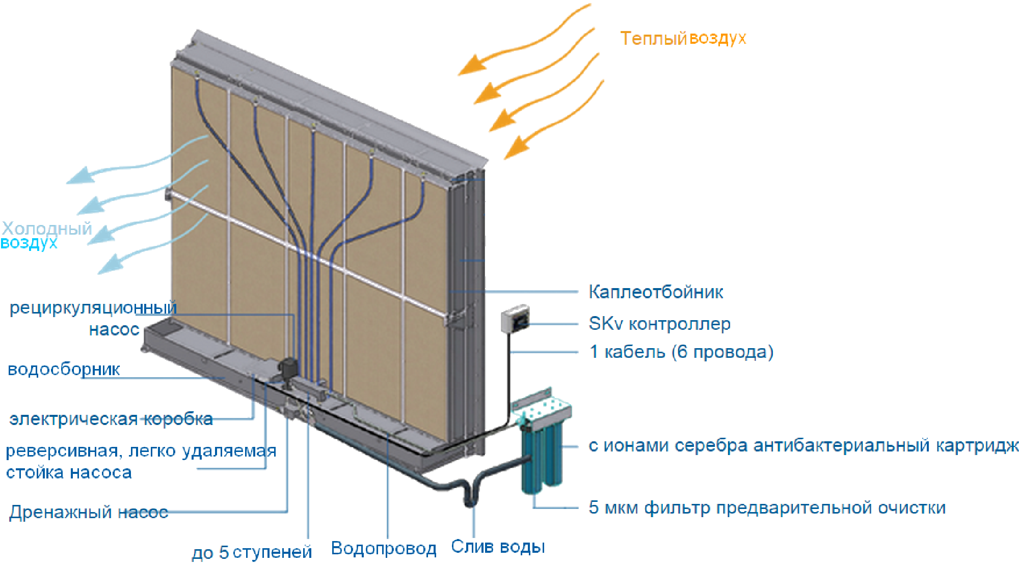Та часть водной массы, которая не была поглощена материалом, возвращается обратно в поддон. В этот момент поток воздуха, который проходит сквозь кассеты производит испарение жидкости с ее поверхности, обеспечивая соответствующие условия для увеличения показателя влажности.
