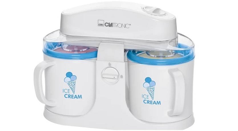 Отличной моделью, позволяющей приготавливать любимое лакомство в домашних условиях, является мороженица от компании Clatronic. От прочих полуавтоматических моделей, представленных в нашем обзоре, этот прибор отличается наличием сразу 2 чаш, объёмом 0,5 кг каждая. Такая конструкция позволяет приготовить сразу около килограмма холодного десерта, причём с разными наполнителями. В зависимости от используемых ингредиентов время работы варьируется от 15 минут до получаса. Правда, перед началом работы чашу придётся охлаждать в холодильнике не менее 12 часов.