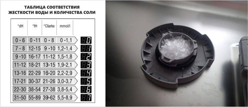 Почти все современные модели оснащены датчиком, указывающим на необходимость заправки ионообменника. Расход соли зависит не от числа циклов мойки, а от расхода воды, потраченного за программу, в литрах.