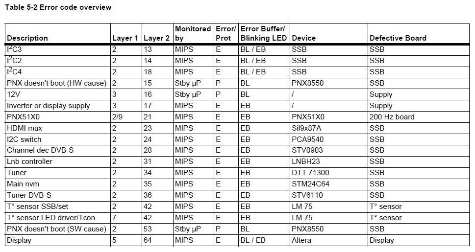 Такой способ самодиагностики позволяет быстрее выявить неисправный компонент. В сервисных инструкциях на конкретную модель приведены так называемые коды ошибок, в которых каждая комбинация миганий индикаторов соответствует возможным отказам различных узлов телеприемника. Это значительно облегчает жизнь телемастеру при диагностике, направляя его по верному пути. Например, 13 миганий светодиода через паузу в телевизоре Sony на шасси FIX2 свидетельствует о проблемах с подсветкой. Неисправными могут быть инвертор или лампы, вот их мы и будем диагностировать. В качестве примера приведу таблицу с кодами ошибок телевизоров Philips на шасси Q552.1E LA. Первый уровень ошибок (Layer 1) мы видим сразу при возникновении дефекта, второй уровень (Layer 2) можно наблюдать, если перевести приемник в сервисный режим.