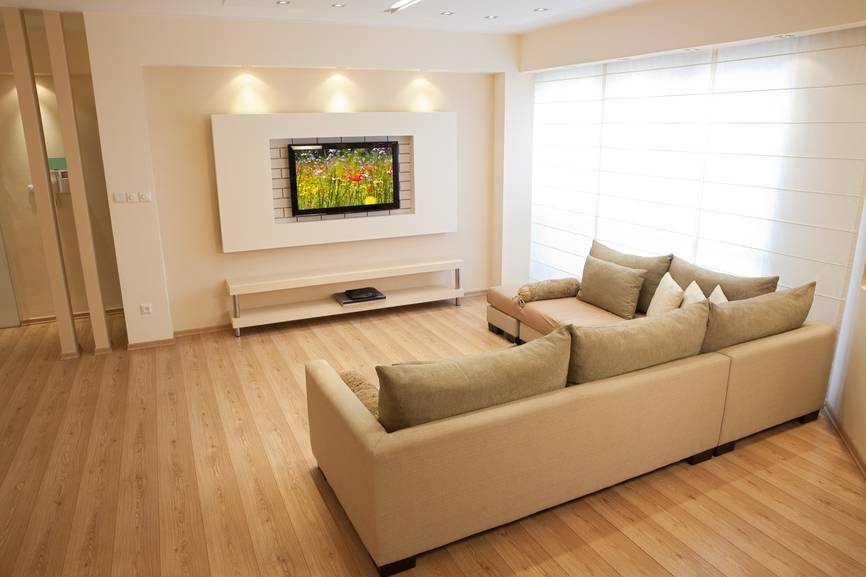 Гостиные оборудуются удобной мебельной стенкой, имеющей место для установки телевизора, приставки, плеера, ресивера, проводов, дополнительных устройств. Отличный вариант для просмотра фильмов на диване/кресле у противоположной стены комнаты. Размещение происходит на расстоянии 0.75 – 1 метр от пола.