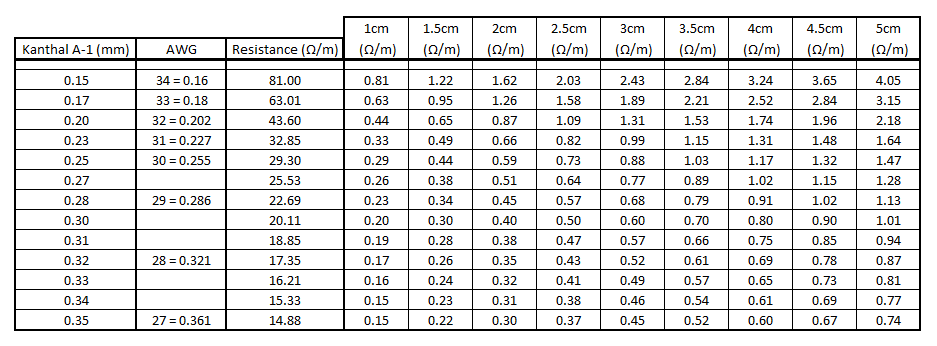 - Толщина. Чем больше диаметр проводника, тем ниже его электрическое сопротивление. Но стоит заметить, что наращивание толщины потребует и большего расхода электроэнергии, что скажется на заряде батареи. К тому же, при наращивании толщины, чтобы достичь сопротивления свыше 0,4 Ом, будет сложно создавать витки.