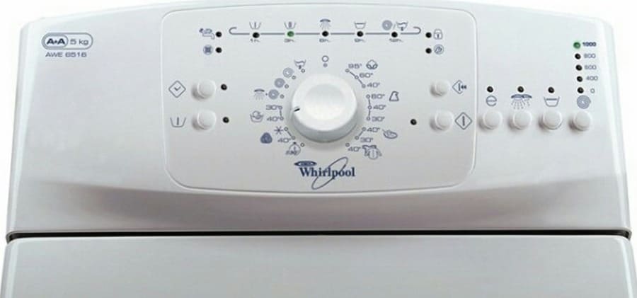 Светодиоды на панели управления старых моделей Whirlpool располагаются над ручкой переключения программ. Считать лампочки необходимо слева направо. Так, первым будет индикатор «Нет подачи воды», вторым «Предварительная стирка», третьим «Стирка», четвертым «Полоскание», пятым «Остановка с водой», шестым «Слив/Отжим», седьмым – «Распахнута дверца». Что касается нижних, то восьмым считается диод «Почистить фильтр», девятым – «Сервис».