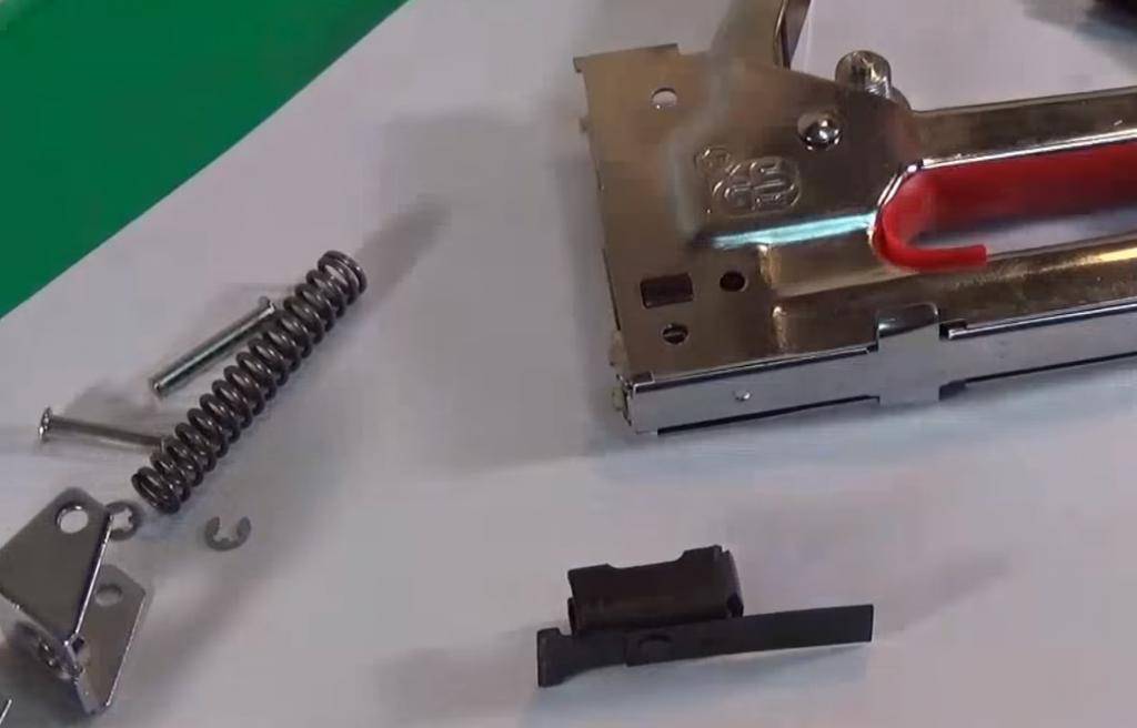 Рассмотрим особенности ремонта мебельного степлера на примере такой неисправности, когда выстреливают две скобы. Почему степлер выстреливает двумя скобами, и можно ли исправить такую поломку? Для начала надо разобраться, почему он выстреливает двумя крепежами. Причинами такой неисправности является ослабевание прижима кассеты скоб. Прижим обеспечивается за счет досылателя. Со временем пружина теряет свои прижимные свойства, что приводит к возникновению такого дефекта, когда прибор выстреливает сразу двумя скобами.