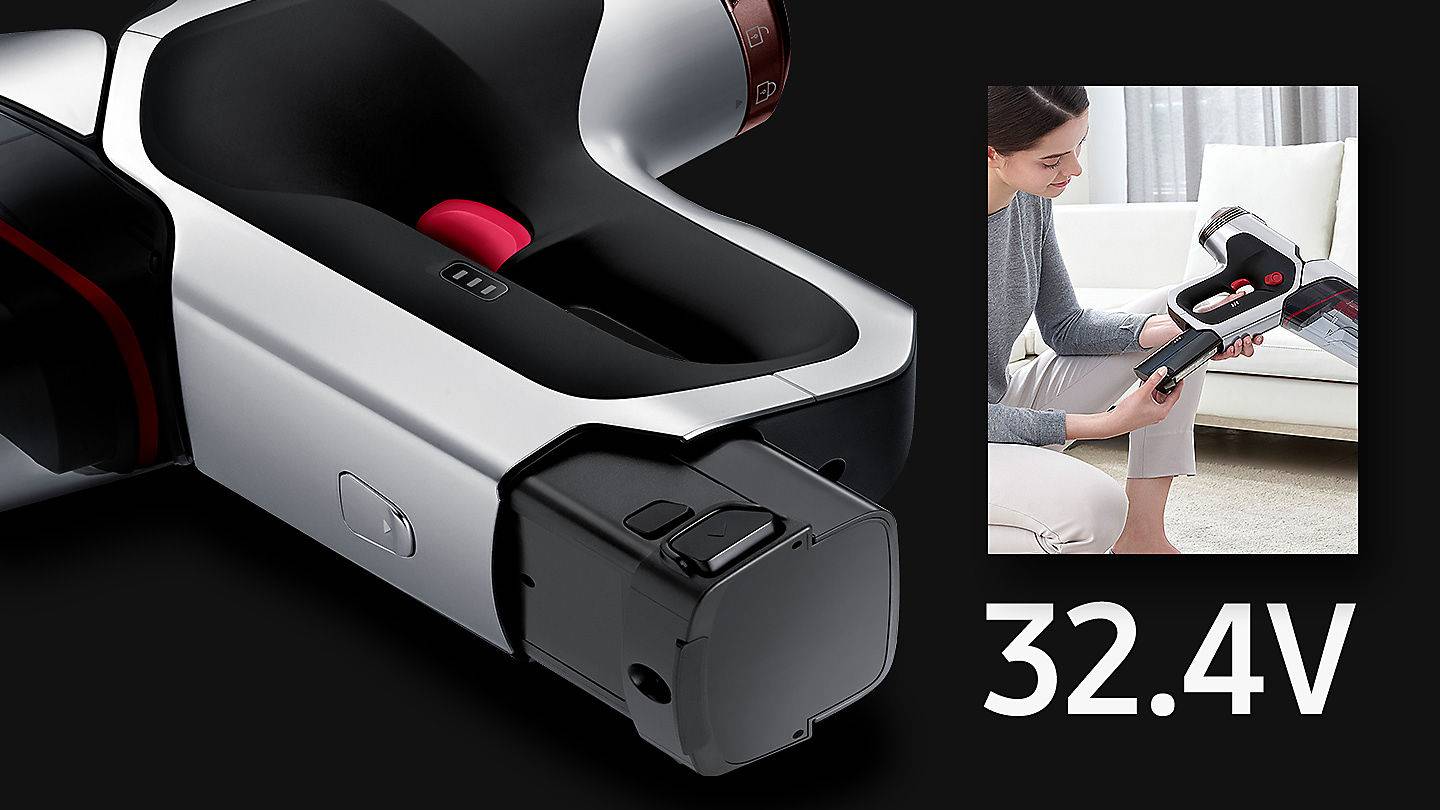 Новинка оснащена инверторным мотором мощностью 150 Вт, обеспечивающим высокую производительность при уборке. Аккумулятор в 32.4 Вт способен дать 40-минутную непрерывную работу аппарата. Срок службы такой батареи в среднем составляет 5 лет.