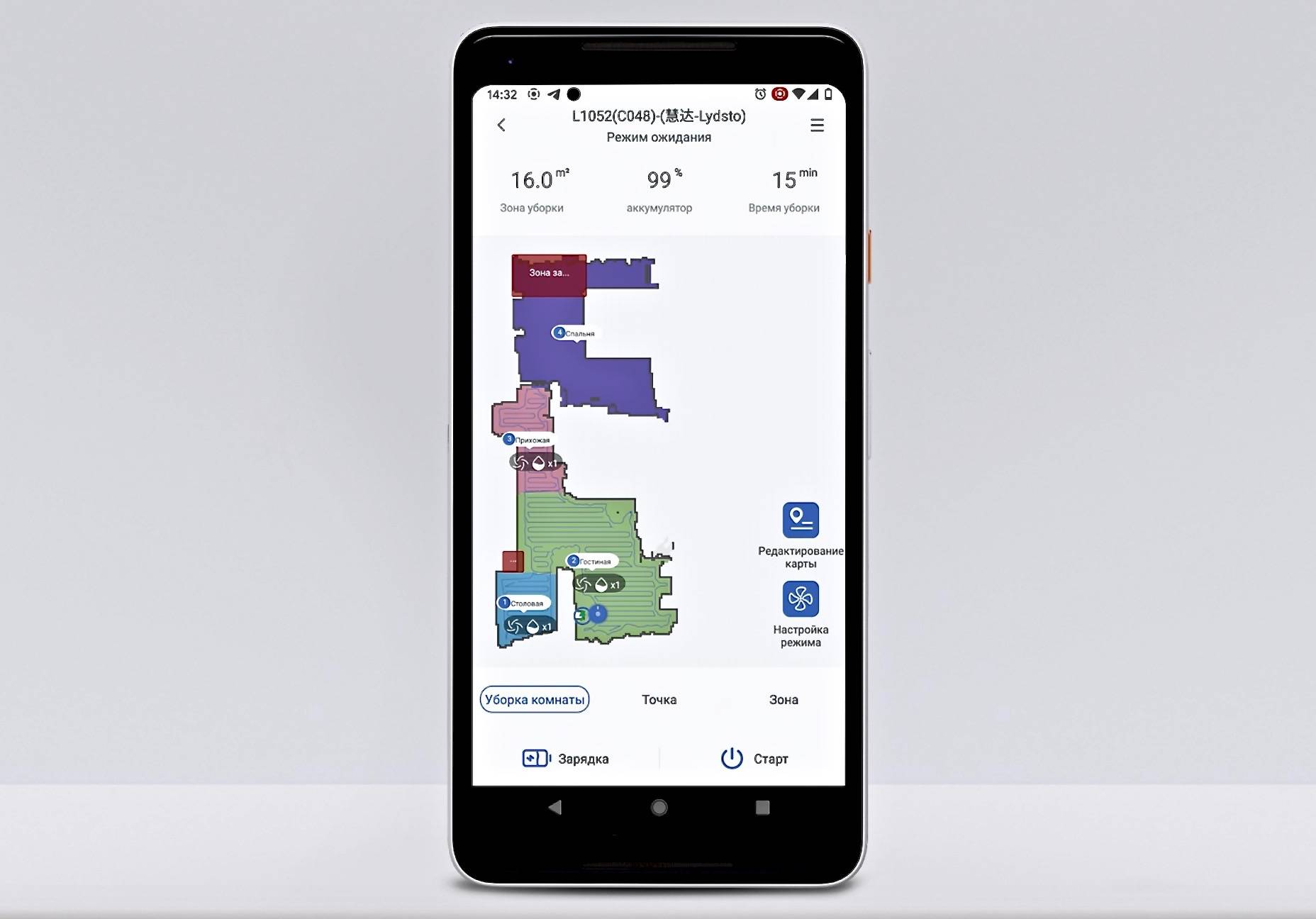 Прежде всего рассмотрим редактор карты. Здесь можно менять границы комнат, давать им привычные названия и выбирать для каждой комнаты параметры уборки: мощность всасывания, обильность смачивания и количество проходов. По умолчанию Lydsto R1 делает один проход, но если поставить галочку «дополнительная уборка», робот пройдёт каждый участок дважды. Также в редакторе можно устанавливать запретные зоны как для сухой, так и для влажной уборки; отправлять робота в выбранную точку на карте и обводить целевые зоны.
