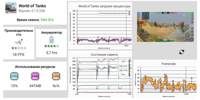 Проверка в игровых приложениях тоже показала не лучшие, но неплохие результаты – например, в World of Tanks: Blitz показатель составил 40–60 fps в обычном режиме.