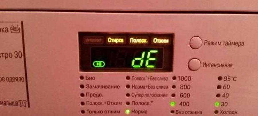 На стиральных машинах LG без дисплея код DE обозначается: одновременно мигают или горят все индикаторы температуры, режим стирки и полоскание. Такие сигналы указывают на то, что дверца люка не закрыта.