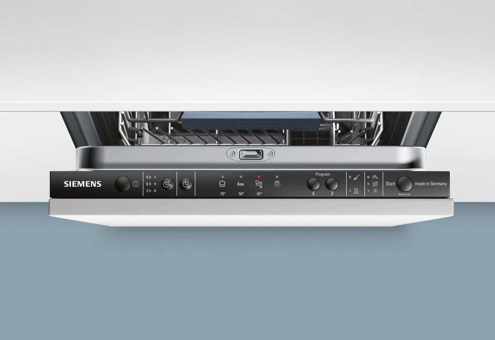 Siemens SR 25E830 – стильная посудомоечная машина вместимостью 9 комплектов посуды. Габариты (ШхГхВ) составляют 45 x 60 x 85 см. Всего в машине 5 программ мойки, среднее время мойки составляет 185 минут, но есть и быстрый цикл на 30 минут. Класс энергопотребления, сушки и мойки наивысший А. Цена составляет 42 тыс. рублей.