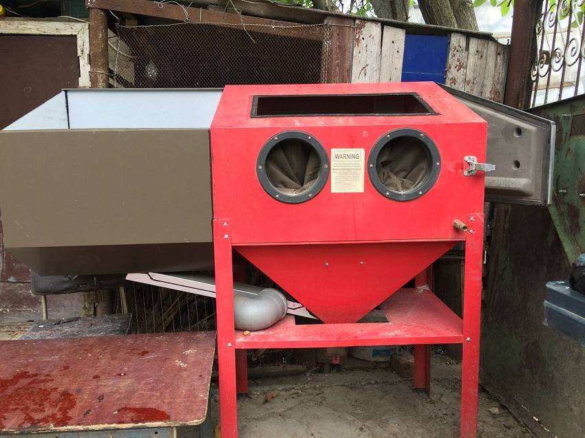 Если просматривать фото пескоструев, можно обратить внимание на то, что камера представляет собой конструкцию прямоугольной формы. Чаще всего это ящик, сваренный из металлического уголка, который обшит тонкими стальными листами толщиной до 1 мм