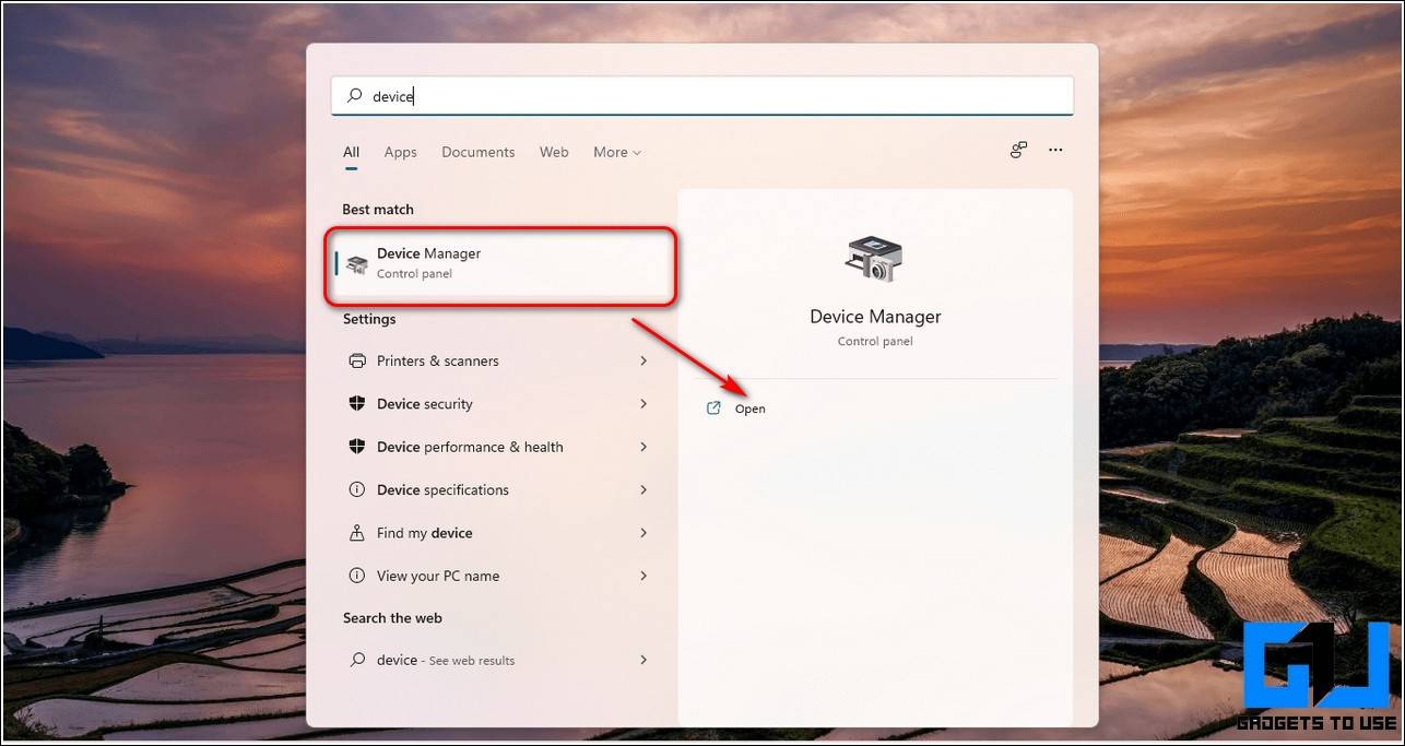 Нажмите клавишу Windows и найдите приложение «Диспетчер устройств», чтобы открыть его.