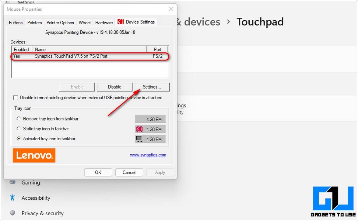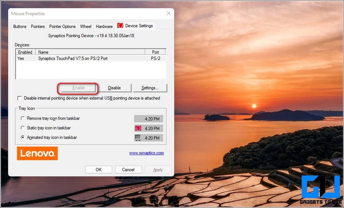 5) Выберите Вкладка сенсорной панели (или же Вкладка ‘Оборудование’ или же Вкладка настроек устройства ) и убедитесь, что ваша сенсорная панель включен .