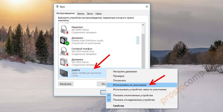 В списке появившемся представлено все, что можно использовать. Иногда нет звука на телевизоре через разъем HDMI с компьютера (в Windows 10 все аналогично), так как ТВ не используется по умолчанию. Кликните по его пиктограмме и внизу выберите соответствующий параметр. Если изображение идет, то иконка должна быть в списке. Если ее нет, проверьте, плотно ли разъемы вошли в гнезда.