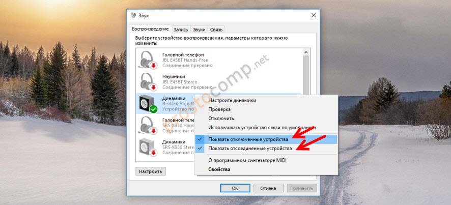 Если вы все сделали, но звук на телевизор не идет, то проверьте, не скручена ли громкость на самом телевизоре и не отключен ли на нем звук. Бывает, что телевизор не отображается в списке устройств для воспроизведения. В таком случае попробуйте установить галочки возле «Показать отключенные устройства» и «Показать отсоединенные устройства». Если ТВ после этого появится (со статусом «Отключено»), то нажмите на него и выберите «Включить». После чего сделайте его устройством по умолчанию.