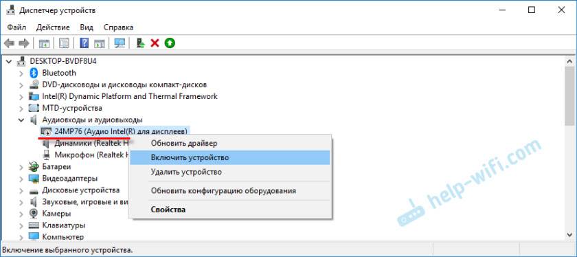 Так что обязательно проверяем эти три раздела в диспетчере устройств. Может у вас там действительно какой-то адаптер отключен и из-за этого все проблемы со звуком на телевизоре, или мониторе.