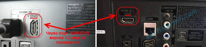 Если изображение через HDMI есть, а звук отсутствует на телевизионной технике, сначала проверьте правильность подключения. Телевизоры на задней панели комплектуются несколькими портами. На старых приемниках можно встретить разъем HDMI, который передает только картинку, а звук не транслирует. Это старая версия интерфейса (1,3), которая обозначается в скобках «DVI».