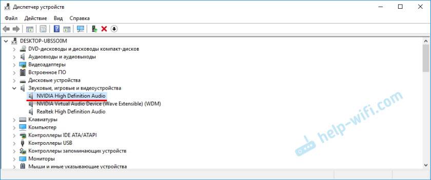 Так же проверьте вкладку “Звуковые, игровые и видеоустройства”. Там может быть адаптер “NVIDIA High Definition Audio”, или AMD. Это уже зависит от установленной видеокарты.