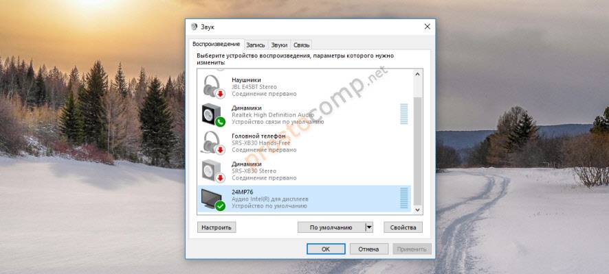 У меня, например, монитор с колонками подключен по HDMI отображается на вкладке “Аудиовходы и аудиовыходы”. Обязательно смотрим эту вкладку. Может там отображается телевизор, который по HDMI подключен и на который звук не выводится. В моем случае, это “Аудио Intel для дисплеев”.