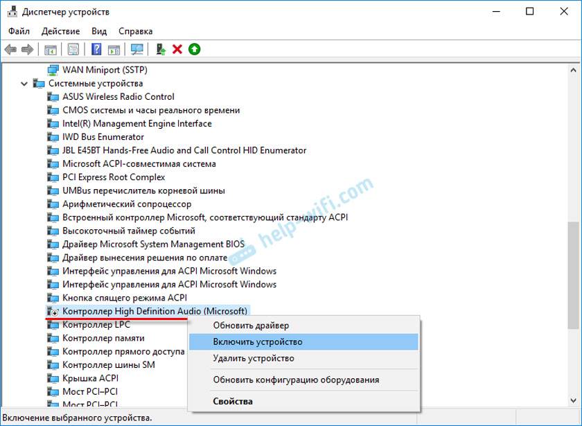 Поэтому, идем в диспетчер устройств, открываем вкладку “Системные устройства”, находим там “Контроллер High Definition Audio (Microsoft)” и смотрим, нет ли возле него каких-то значков. Если есть, нажимаем правой кнопкой мыши и пробуем включить.
