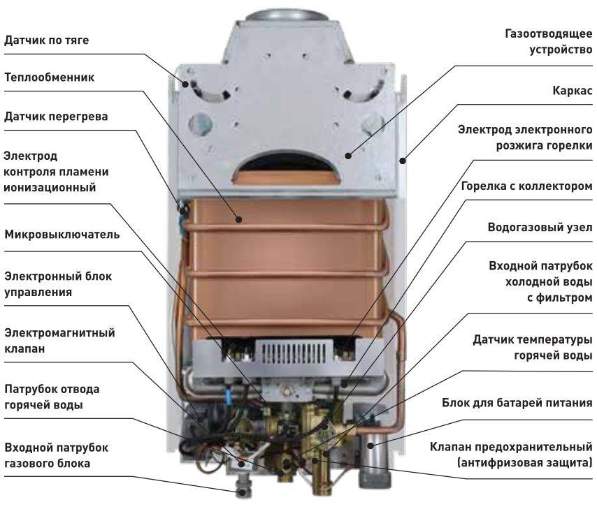 Газовая колонка «Нева», начиная от первых советских и заканчивая современными моделями, состоит из нескольких узлов:
