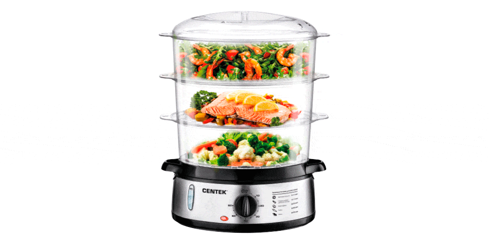 На втором месте рейтинга стоит CENTEK CT-1457. Это единственная трёхъярусная модель в рейтинге. Три взаимозаменяемые чаши общим объёмом 9 л из прозрачного пластика обеспечивают возможность контроля процесса готовки. В одной из корзин есть поддон с углублениями для варки яиц. А также в комплект поставки входит чаша для приготовления риса.