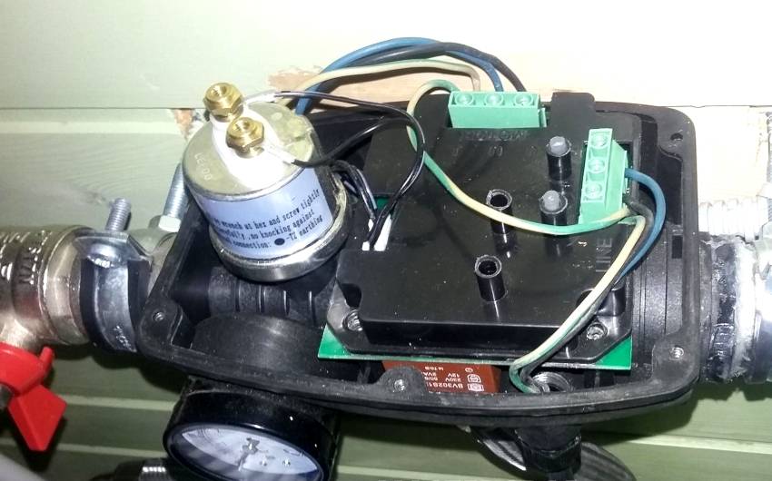 Через них проходит малый ток на электронную часть устройства. Она состоит из мощных элементов, управляющих подачей напряжения на водяной насос.