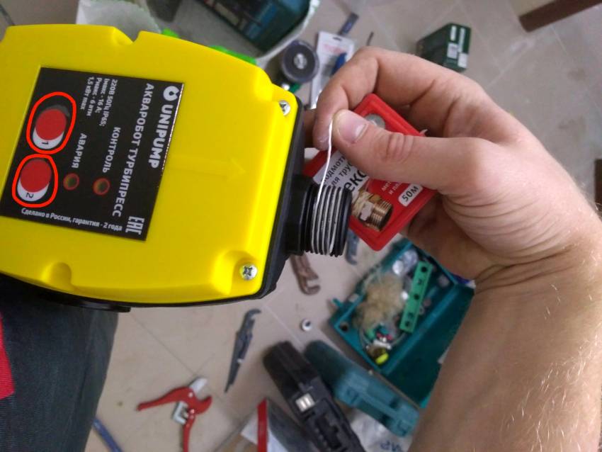 При достижении настроенного значения блок управления производит отключение насоса. При падении ниже установленного показателя нагнетатель снова запускается.