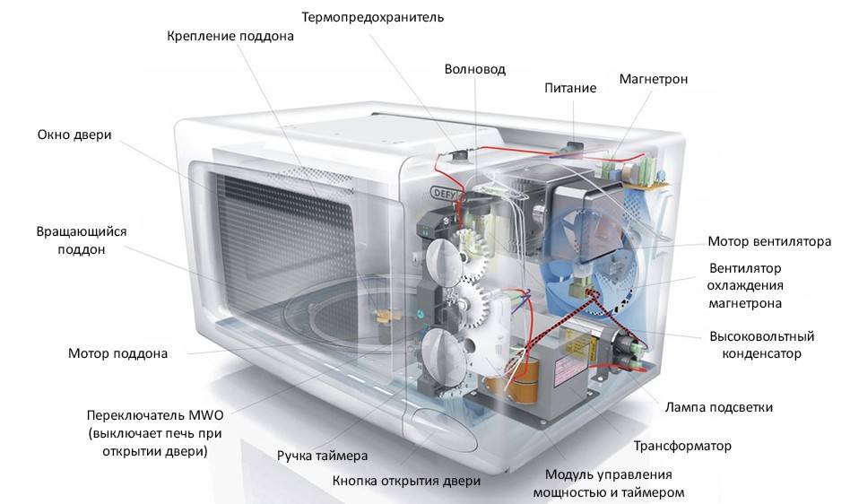 Чтобы сделать ремонт своими руками, когда поломка вызвана отказом какой-либо детали, необходимо знать, как устроена микроволновка. Высокочастотное излучение, которое разогревает еду, создаётся магнетроном, соединённым с камерой волноводом прямоугольной формы. В зависимости от модели он закрыт со стороны камеры куском слюды или крышкой из пластика.