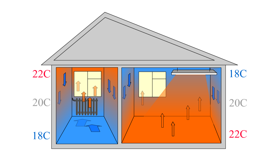 Попадая на поверхности, находящиеся в пределах видимости, ИК-лучи повышают их температуру. После этого вступает в действие принцип конвекции, тепло начинает передаваться от поверхностей воздуху комнаты. Такой прогрев является более равномерным, чем при работе традиционных конвективных систем, что и отражено на рисунке: