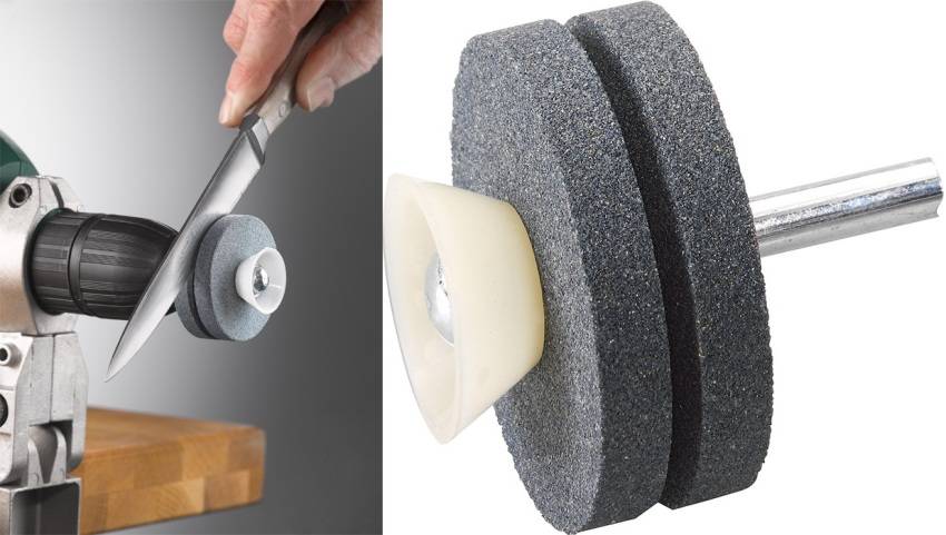 Данное приспособления состоит из пластикового корпуса, внутри которого вращается специальный по форме наждачный круг. Именно он позволяет формировать необходимый угол заточки на рабочей части инструмента. Круг насажен на вал, который соединен с дрелью специальной муфтой. Он приводится в действие при включении инструмента.