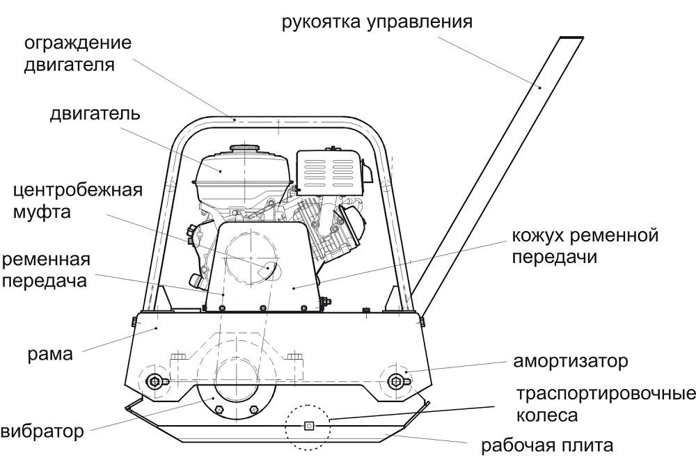 Главным рабочим элементом является тяжелая металлическая платформа, которая может быть изготовлена из серого ковкого чугуна или стали. Вибрационное воздействие на нее передается от механического вибратора, приводимого в движение бензиновым, дизельным или электрическим двигателем.