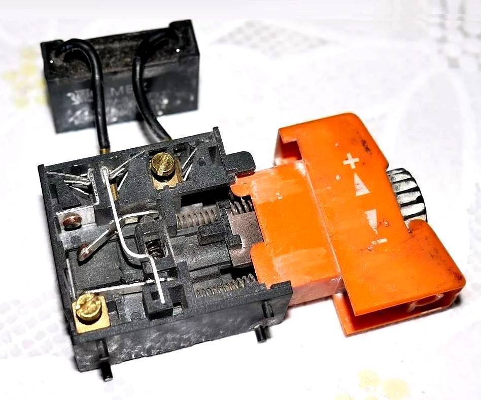 Эта деталь имеет весьма простую конструкцию, но при возникновении неполадок будет препятствовать включению дрели. Работа ее простая: клавиша скользит в специальном блоке, и пальцем-толкателем замыкает контакты. От долгой эксплуатации внутрь блока набивается пыль, которая препятствует перемещению кнопки и блокирует ее, не давая замкнуть цепь контактов. Устраняется дефект просто — вскрыть и удалить пыль при помощи кисточки.