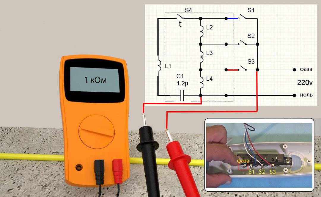 Найдя ее, вызваниваете сопротивление обмотки. Для этого поочередно касаетесь вторым щупом контактов на переключателе.