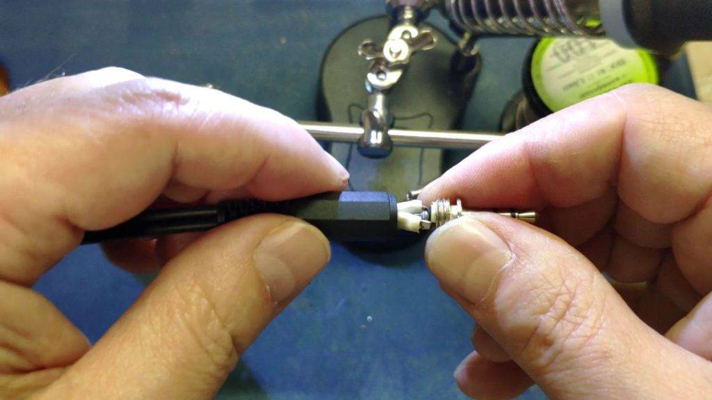 При проворачивании первого звена детали вокруг своего корпуса вы заметите, что звук стал как будто из-под воды, а громкость уменьшилась. Отремонтировать штекер можно, если припаять контакты между звеном и лепестком так, чтобы они не двигались относительно друг друга.
