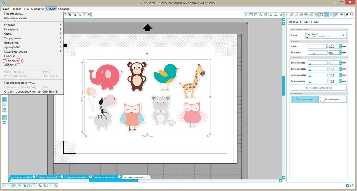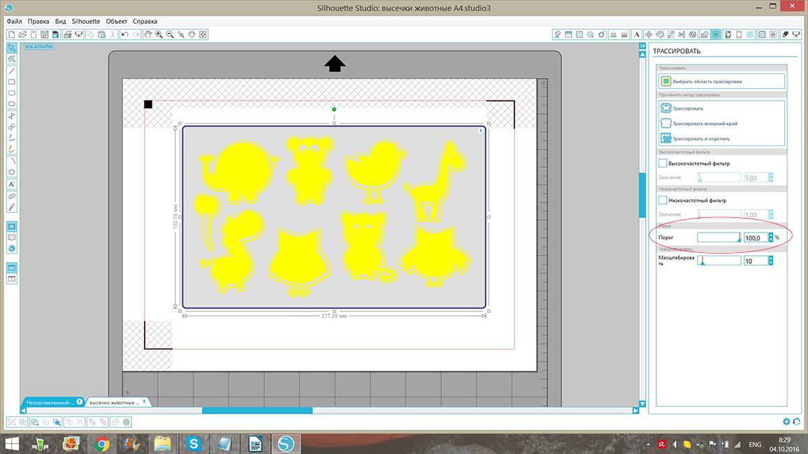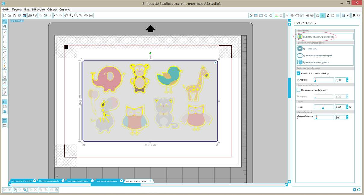 Для резки по контуру нам надо его трассировать. В верхнем меню открываем «объект — трассировать», затем на правой панели нажимаем кнопку «выбрать область трассировки», выделяем наш рисунок, так чтобы все детали попали в затемненный прямоугольник.