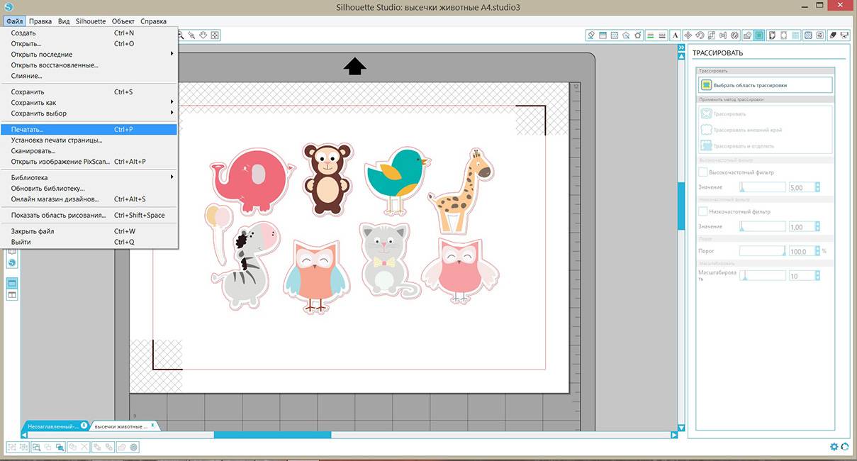 Подключаем принтер к компьютеру и через программу Silhouette Studio печатаем наш рисунок. Нажимаем «файл-печать», затем выбираем «настройки» и в диалоговом окне принтера настраиваем значения для бумаги. Размер бумаги в настройках принтера и плоттера должны быть одинаковыми, затем нажимаем кнопку печать.